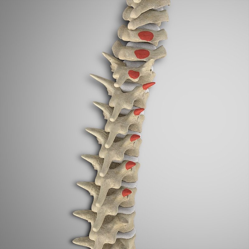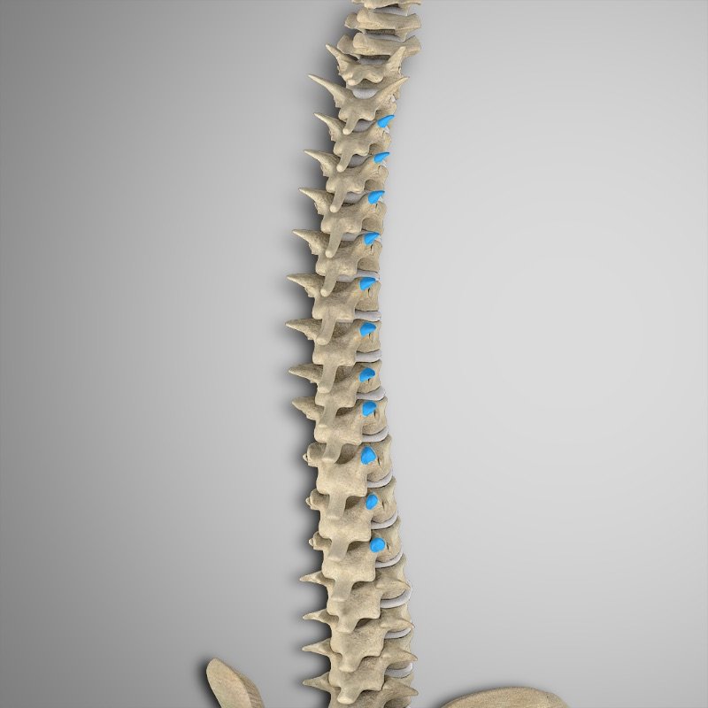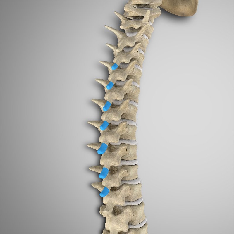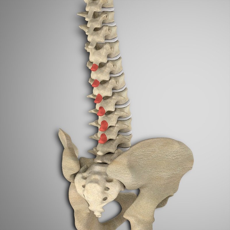 Apófisis espinosas y transversas de todas las vértebras torácicas y lumbares